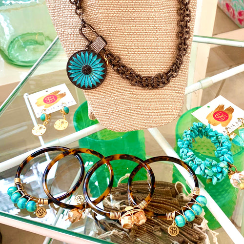 SASSIE ROCKS is an Azalea Coast handcrafted bracelet line. Crafted with a single continuous wrap of gold plated wire to capture a kaleidoscope of Pearls, Quartz, Coral, Glass, Agates and Bone keeping these treasures safe and secure for years to come. Meant to be worn stacked, every SASSIEROCKS! bracelet pairs beautifully with another - so join the Arm Candy Party today!